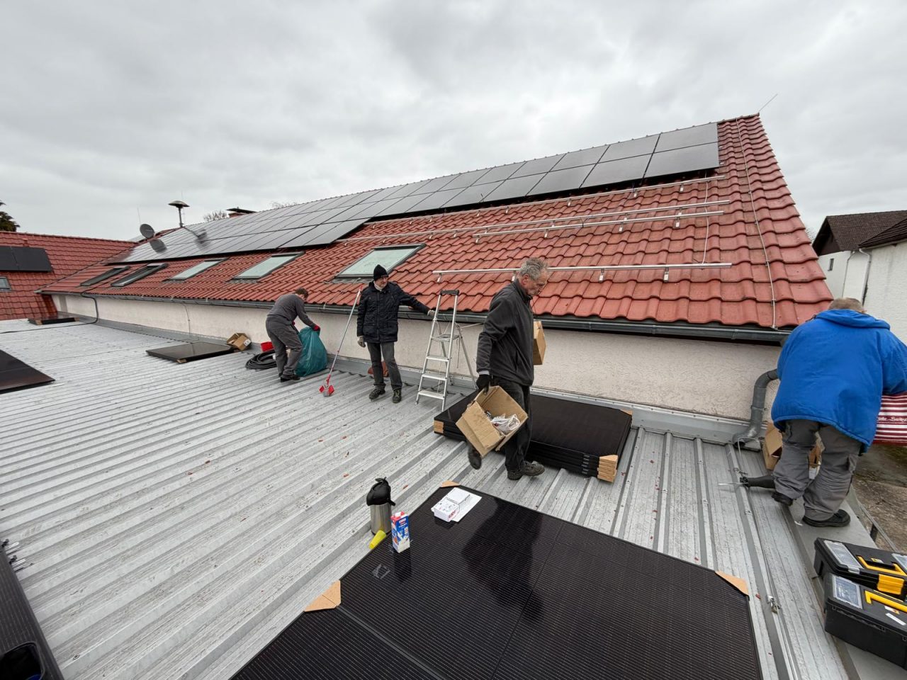 Nach der Montage der Gestelle auf der Westseite des Objektes im November letzten Jahres wurden die Module sowie das Montagematerial auf das vorhandene Flachdach transportiert.